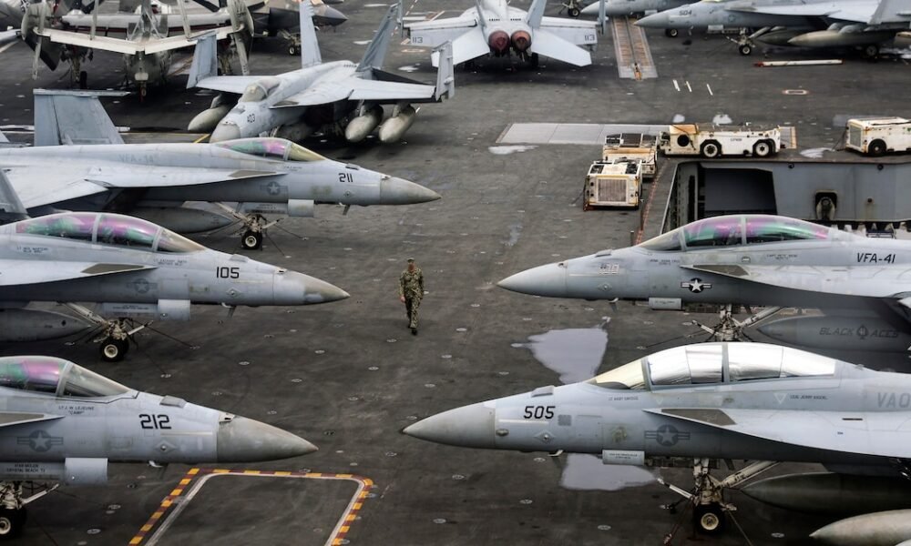 Personas en Teherán caminan sobre banderas estadounidenses e israelíes durante una marcha para conmemorar el 47 aniversario de la revolución islámica de Irán (Arash Khamooshi para...