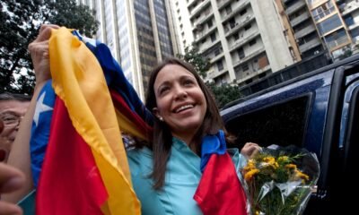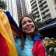 La ex diputada y líder opositora María Corina Machado sostiene la bandera venezolana frente a la Fiscalía General de la República, el miércoles 3 de diciembre...