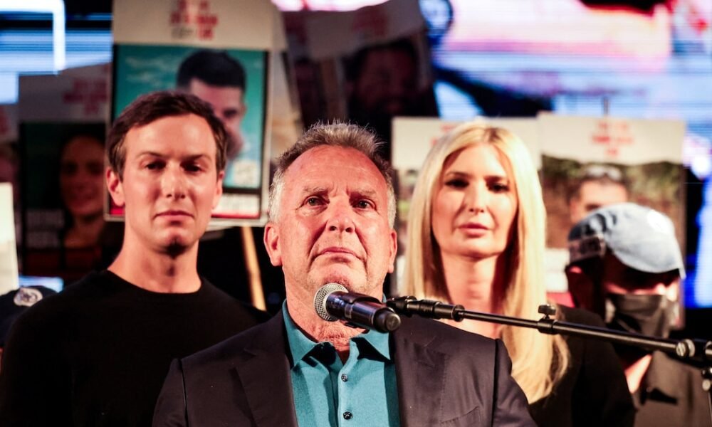 El enviado especial de Estados Unidos para Medio Oriente, Steve Witkoff, habló en la Plaza de los Rehenes, flanqueado por Jared Kushner e Ivanka Trump, en...