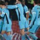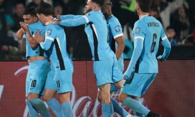 Giorgian de Arrascaeta (izquierda) festeja con sus compañeros de la selección de Uruguay luego de anotar ante Venezuela en el encuentro de la eliminatoria mundialista disputado...