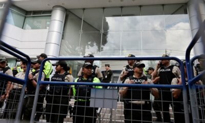 Agentes de policía hacen guardia frente a la Corte Constitucional de Ecuador durante una protesta contra las políticas del gobierno del presidente Daniel Noboa, en Quito,...