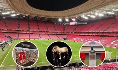 La vista panorámica del estadio San Mamés con sus gradas rojas y los detalles de la camiseta de Iñaki Williams, un león embalsamado y un busto...