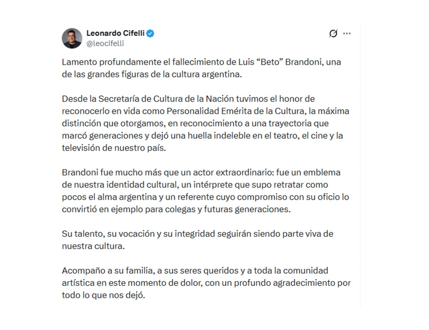 El titular de la cartera resaltó en su mensaje: “Desde la Secretaría de Cultura de la Nación tuvimos el honor de reconocerlo en vida como Personalidad Emérita de la Cultura, la máxima distinción que otorgamos, en reconocimiento a una trayectoria que marcó generaciones y dejó una huella indeleble en el teatro, el cine y la televisión de nuestro país”. El texto circuló desde la madrugada e iba acompañado de un video que repasaba la vida de Brandoni en 3 minutos.